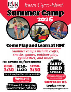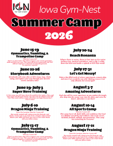 All camps include gymnastics, outdoor play (weather permitting), themed crafts, snacks, games, and fun! With all camps, you have the option of coming 8:30-11:30, 12:30-3:30, or 8:30-3:30. We also offer early drop off and late pick up options. Call to learn more today!