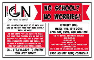 Upcoming No School, No Worries Camp are February 17th; March 4th and 16th-20th; April 3rd and 24th; June 8th-12th