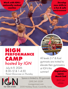 This camp is open to all competitive gymnasts levels 2-7 and all Xcel gymnasts (ages 6-18). There will be a Parent Showcase at 2PM on Thursday. The cost for camp is $425 per gymnast. A $100 deposit is due at the time of registration. Coaches may attend for free with a paying athlete. This camp is a great opportunity for coaches to train with IGN’s National Instructors and learn to spot new skills!